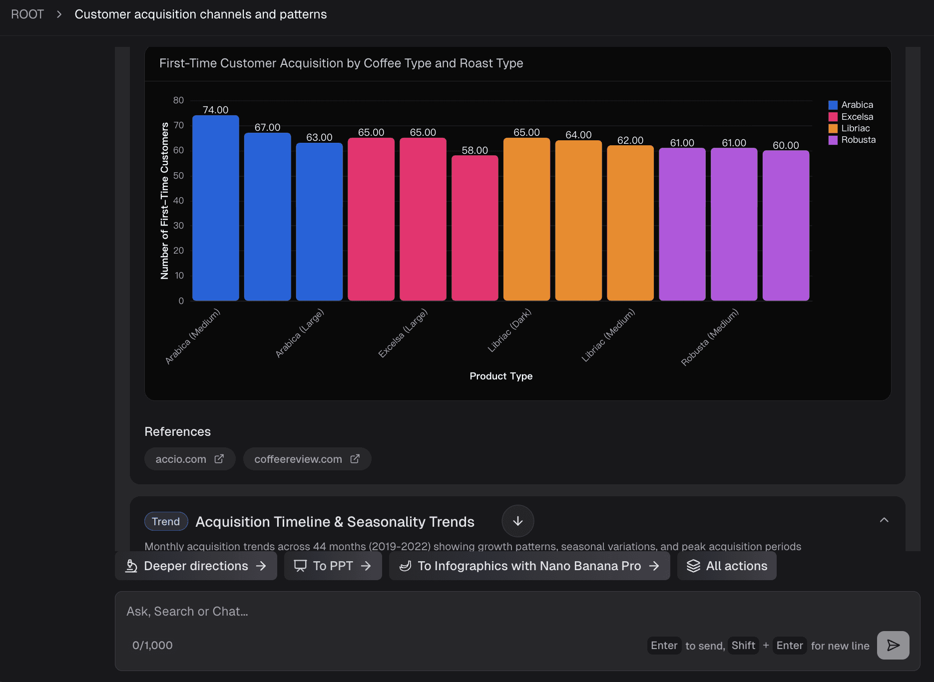 With a single click, convert your newly discovered insights and charts into a fully formatted, professional PowerPoint presentation, ready for your next stakeholder meeting.