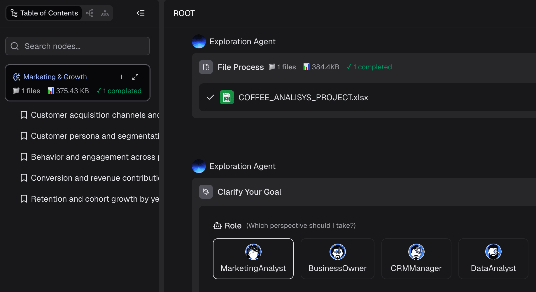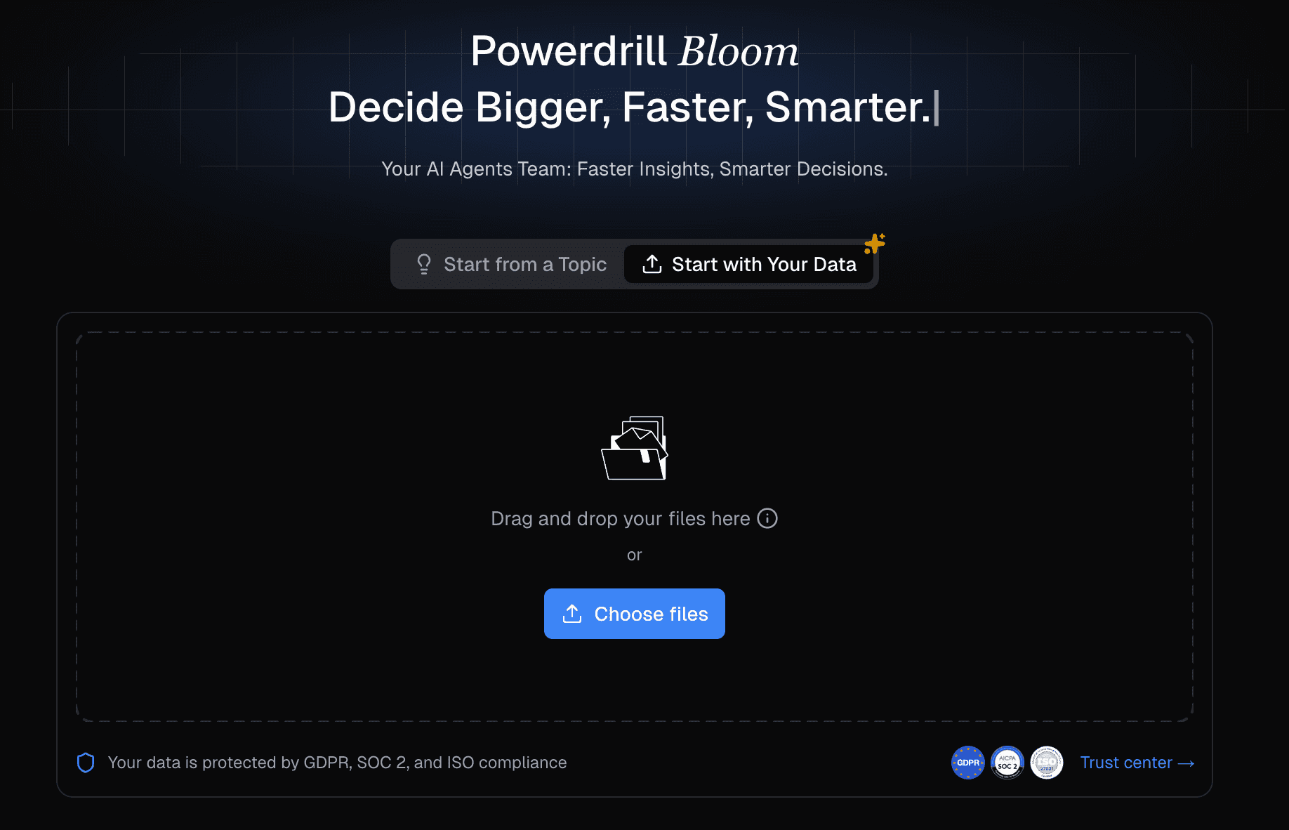 Simply drag and drop your .xlsx or .csv file into the Powerdrill Bloom interface. The AI instantly reads the schema, headers, and data types without requiring you to format the columns manually.